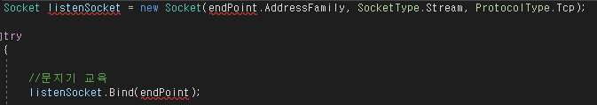 IPEndPoint endPoint = new IPEndPoint(ipAddr, 7777); //7777은 포트 번호 , IP 주소와 포트 번호를 할당한다.