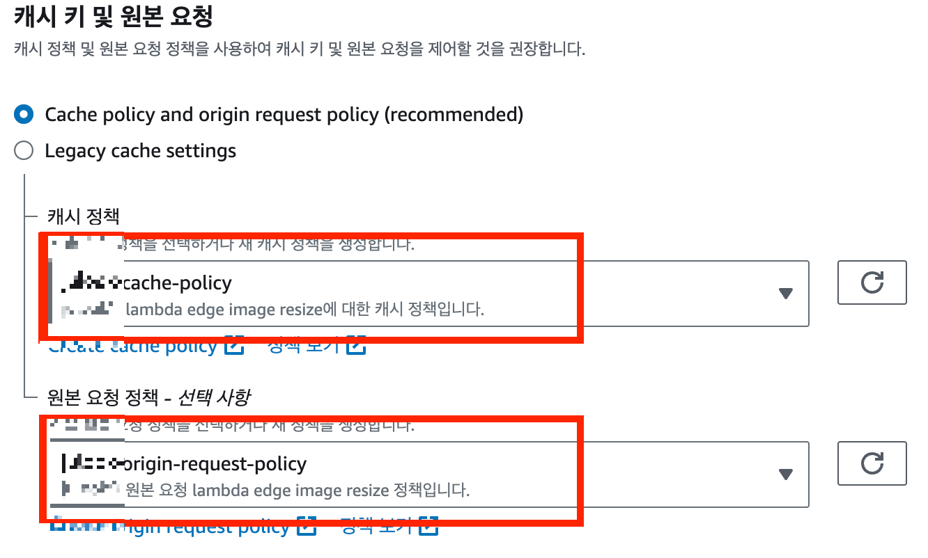 아까 설정한 캐시 및 원본 정책을 선택해 준다. (사용자 정의에 있는 것 선택)