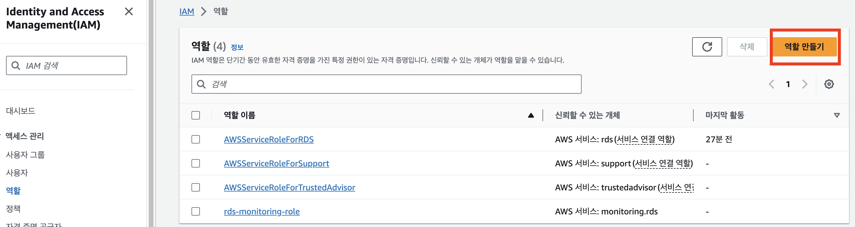 IAM 에서 역할을 눌러 역할 만들기를 클릭한다.