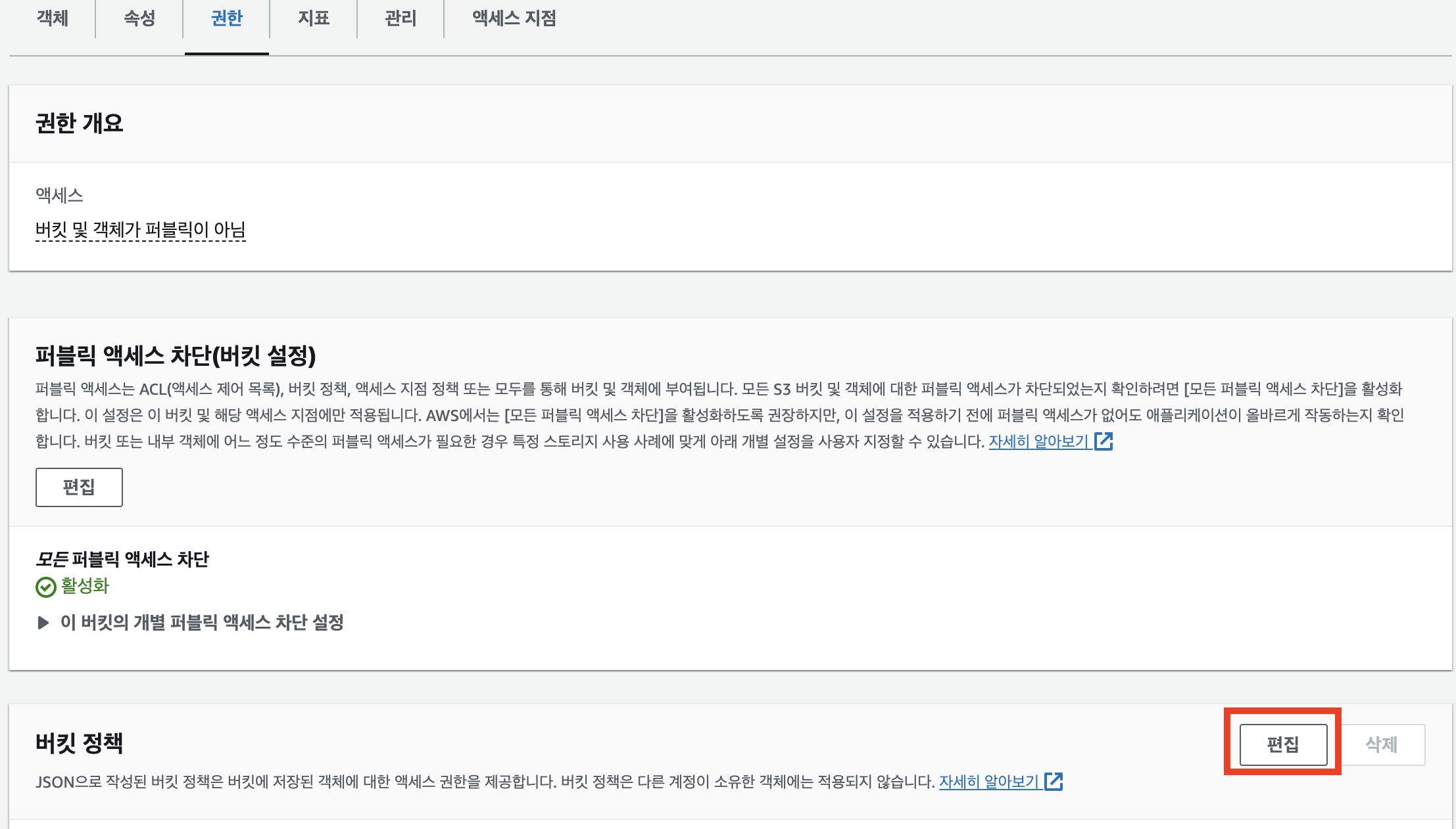 이제 다시 S3 버킷 권한으로 이동해보자.