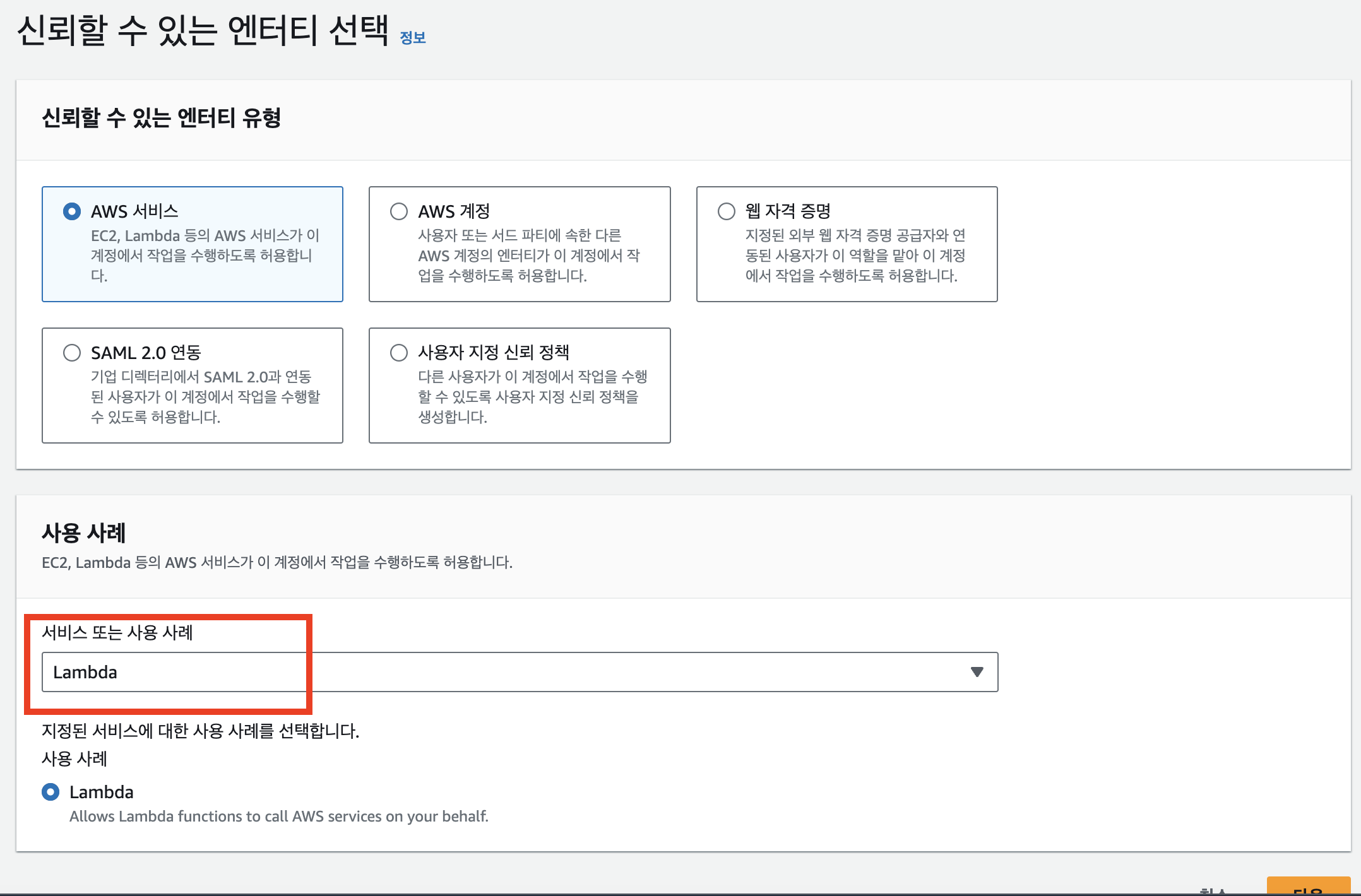 신뢰할 수 있는 엔터티 유형은 AWS 서비스로,