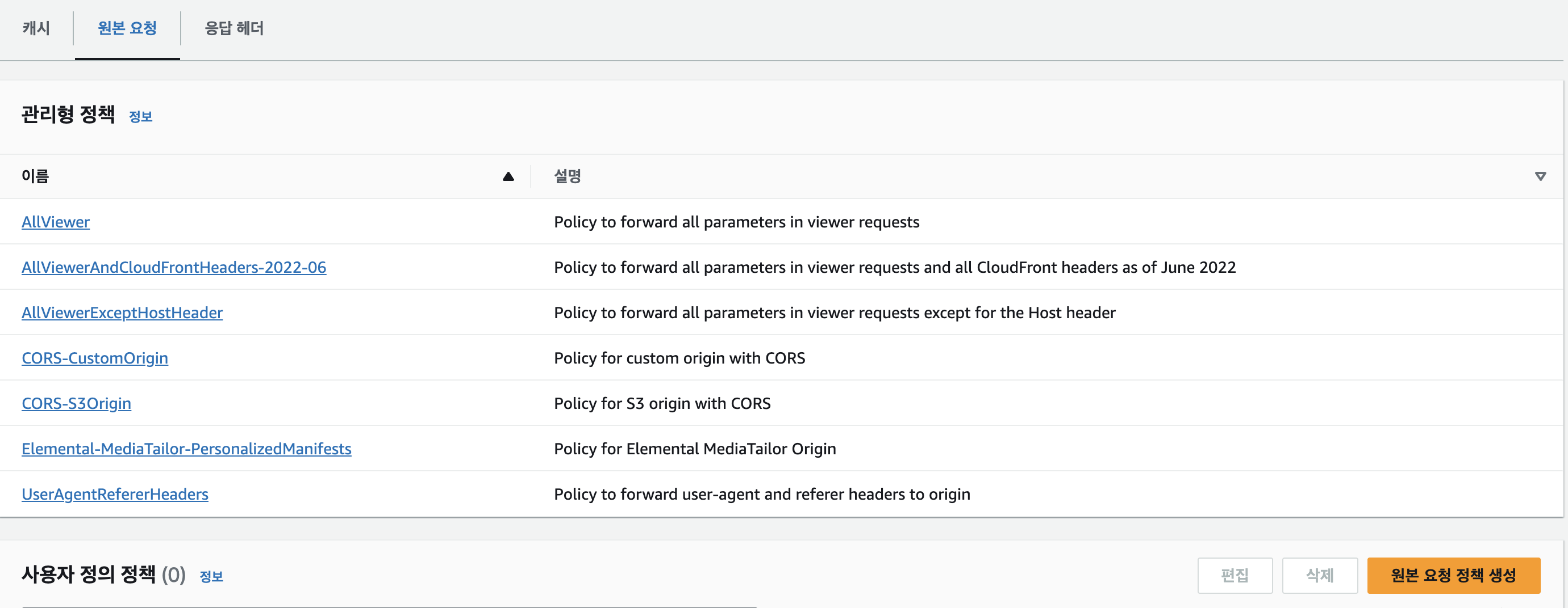 아까는 캐시 정책을 생성했다면, 바로 옆 탭을 눌러서 원본 요청 정책을 생성한다.